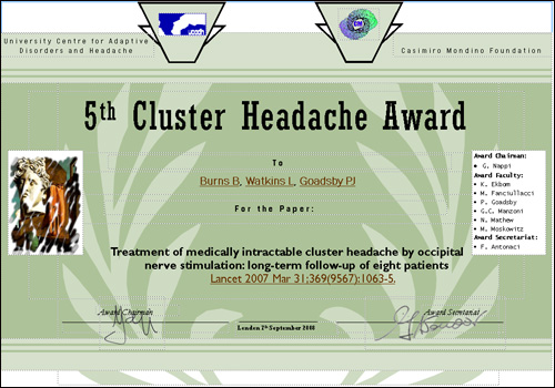 The Scientific Committee has selected and scored 34 manuscripts on Cluster headache published in 2006. The winner of the 5nd Edition (year 2008) has been the paper: Treatment of medically intractable cluster headache by occipital nerve stimulation: long-term follow-up of eight patients written by Burns, B., L. Watkins, and P.J. Goadsby,. Appeared in Lancet, 2007. 369(9567): p. 1099-106.